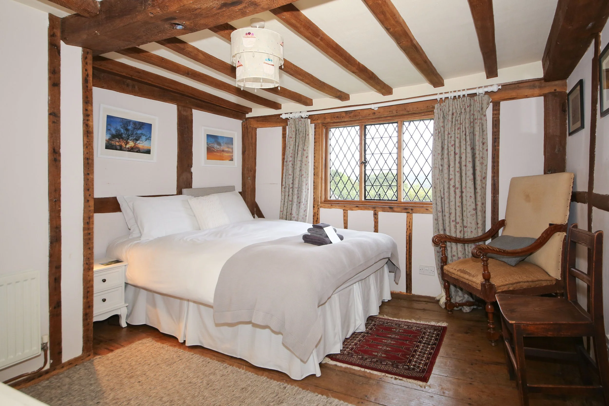 Huge and characterful master bedroom in the farmhouse with double or twin beds. This room has lovely views over the rear gardens, a separate dressing room and ensuite bathroom.